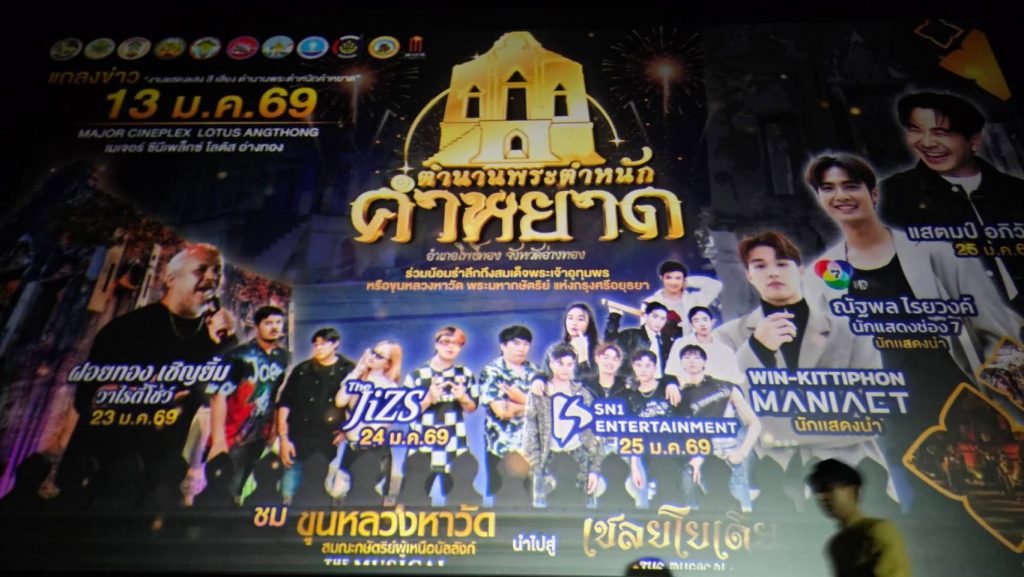วันที่ 13 มกราคม 2569 เวลา 13.30 น. ณ โรงภาพยนตร์เมเจอร์ซีนีเพล็กซ์ สาขาโลตัสอ่างทอง นายนที มนตริวัต ผู้ว่าราชการจังหวัดอ่างทอง เป็นประธานงานแถลงข่าวการจัดงาน การแสดงแสง สี เสียง “เชลยโยเดีย The Musical”ตำนานพระตำหนักคำหยาด โดยมีนายทัศนัย สุธาพจน์ รองผู้ว่าราชการจังหวัดอ่างทอง รองนายกฯเหล่ากาชาดจังหวัดอ่างทอง นายกรวี ปริศนานันทกุล หัวหน้าส่วนราชการ นายอำเภอ ครู/อาจารย์ นักเรียน/นักศึกษา ประชาชนและสื่อมวลชน เข้าร่วม